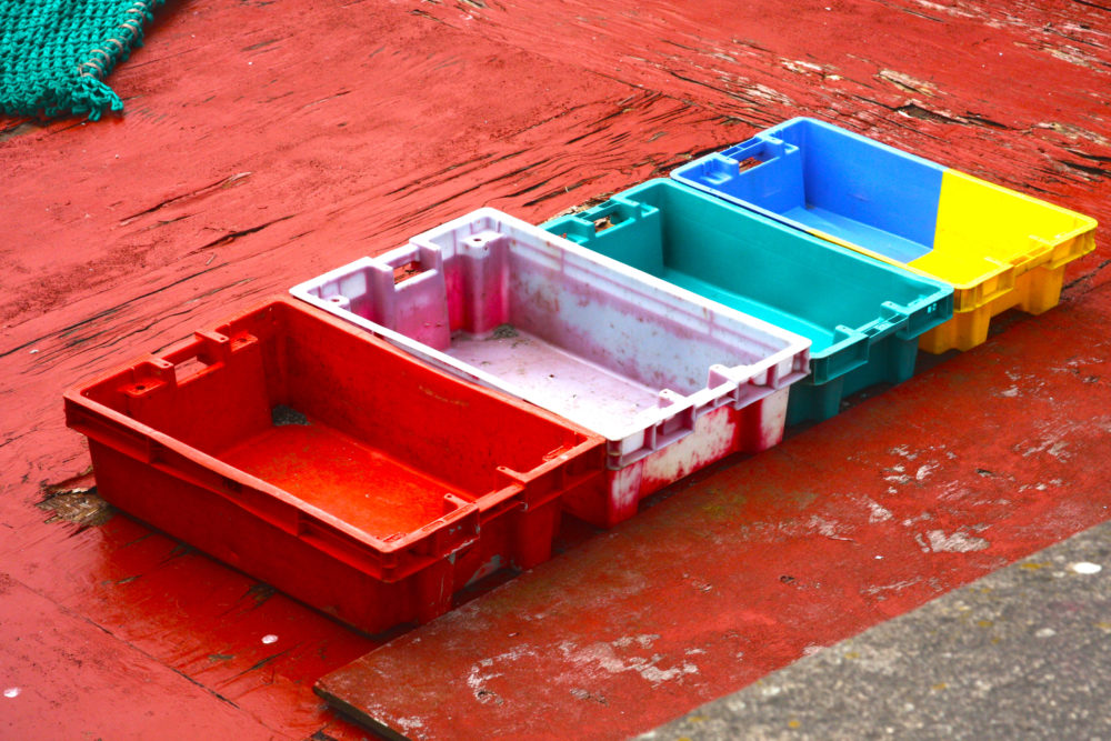 Plastic boxes on fishing boatPlastic boxes on fishing boatPlastic boxes on fishing boat in Cherbourg, Normandy, France